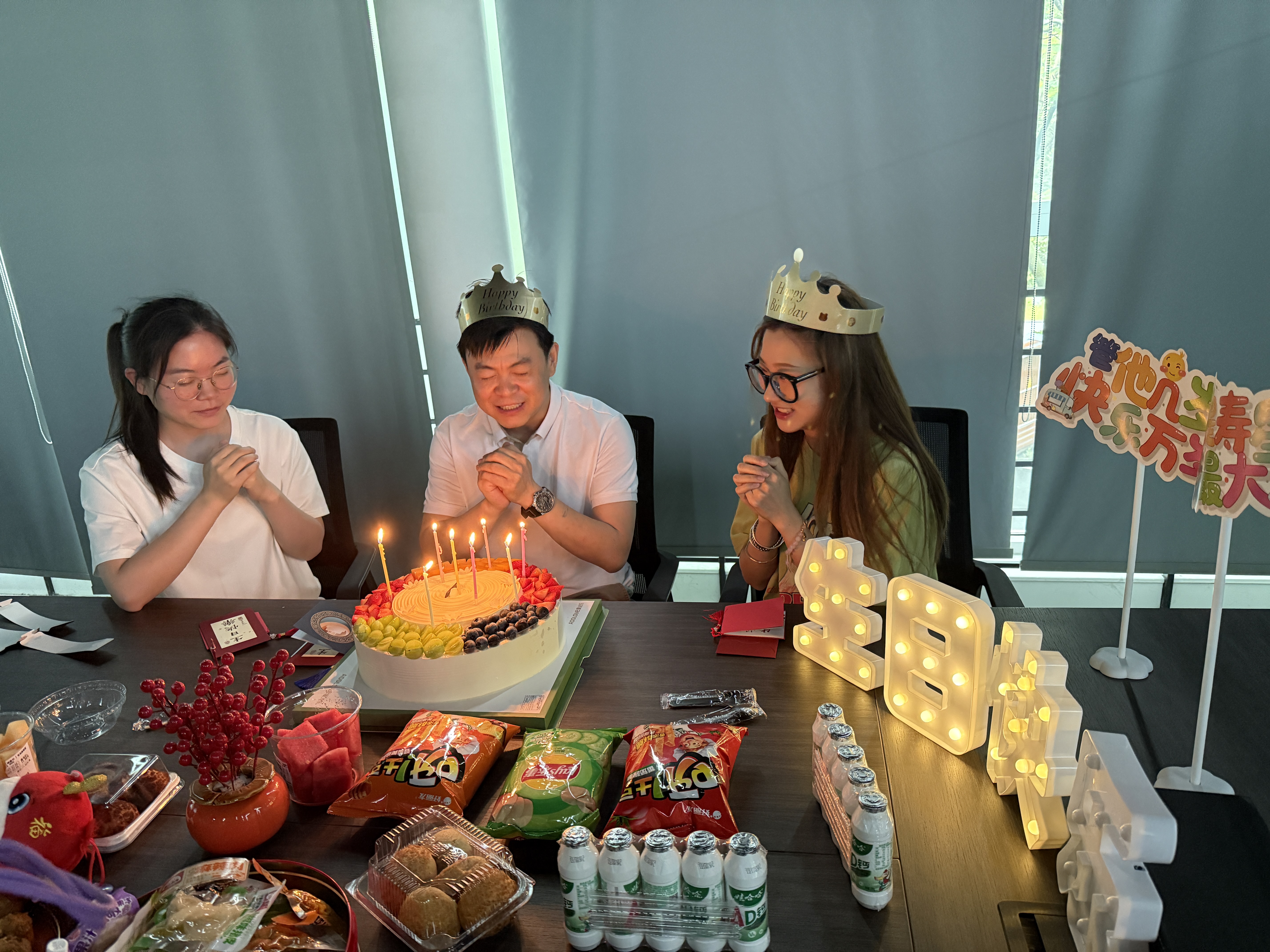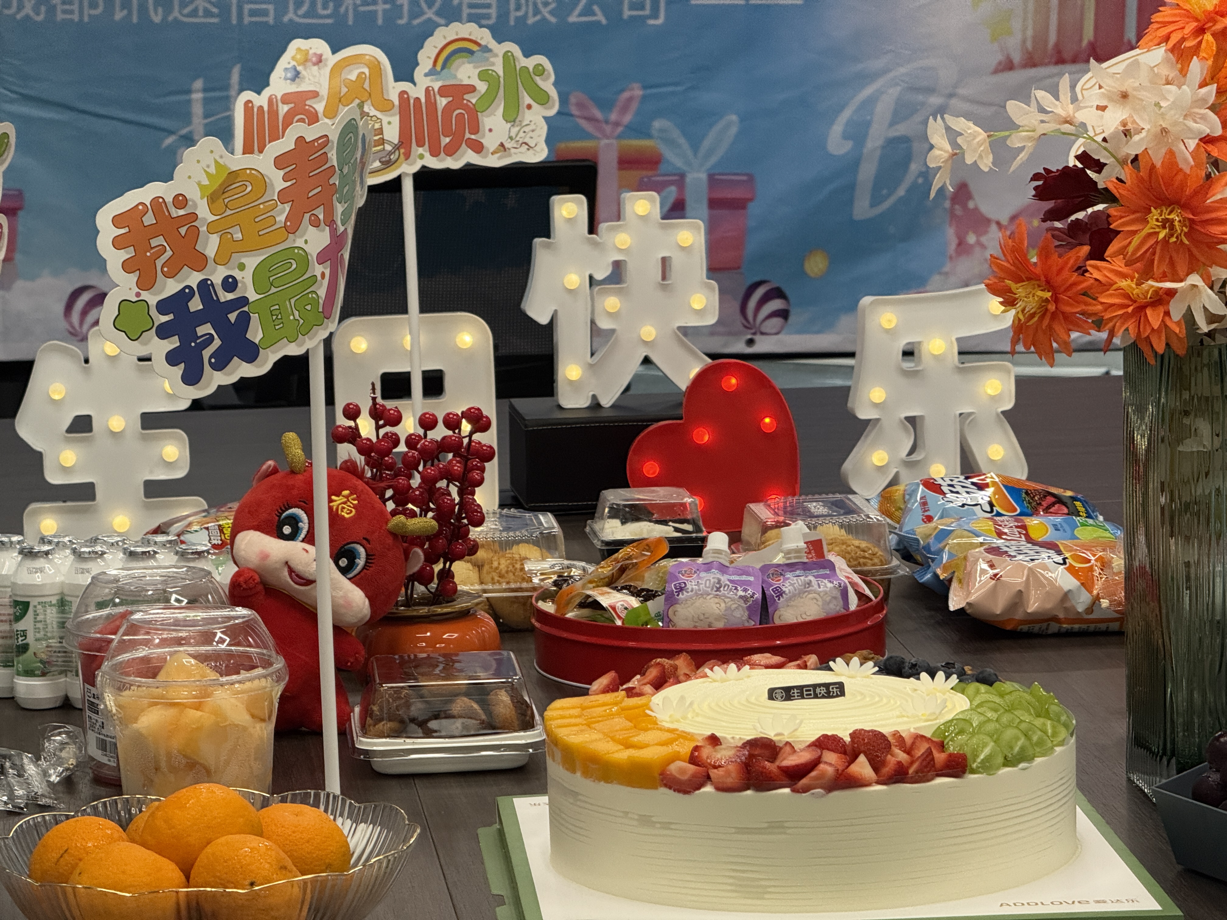 水果、零食、蛋糕、欢笑声……会议室秒变“幸福派对”,寿星们戴上闪闪发光的生日帽,在全体同事的祝福中许下心愿。行政小姐姐精心准备的礼物更是让惊喜值拉满~