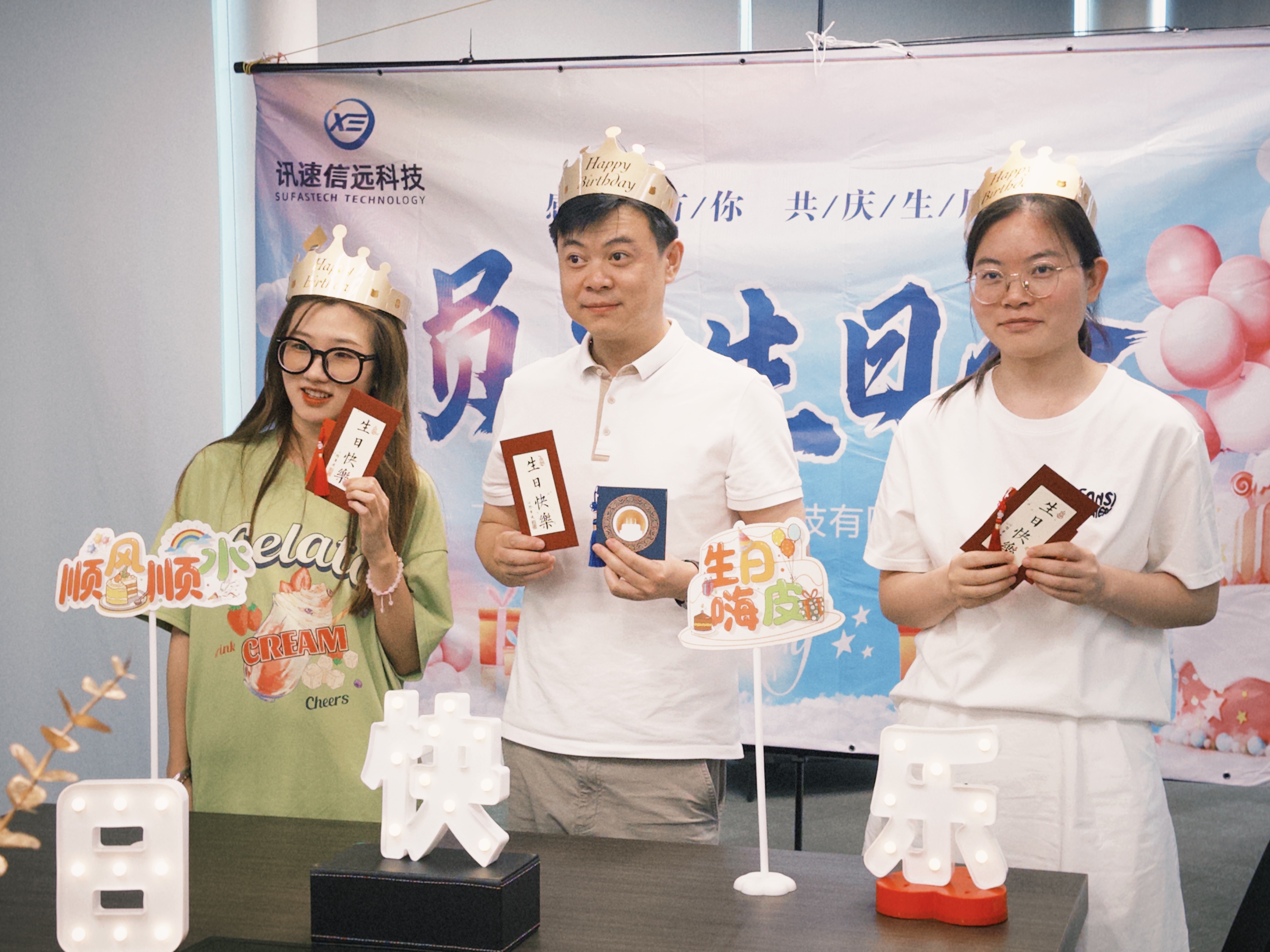 夏意融融的六月七月,讯速信远科技为寿星们准备了一场甜蜜的惊喜! 水果、零食、蛋糕、欢笑声……会议室秒变“幸福派对”,寿星们戴上闪闪发光的生日帽,在全体同事的祝福中许下心愿。行政小姐姐精心准备的礼物更是让惊喜值拉满~ “新的一岁,愿大家眼里有光,脚下有路,生日快乐!” ——这是全体讯速人最朴素的祝福。 未来,我们继续温暖同行,一起闪闪发光!